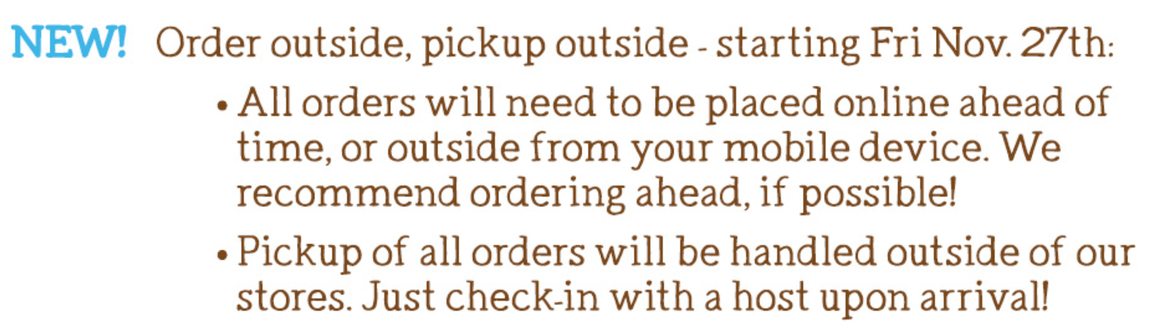 In accordance with the most recently released COVID safety regulations, all California restaurants will be moving to our new outdoor service model starting Monday, December 6th. We’ll continue to provide order pickup and delivery, but will no longer be allowing guests inside of our stores. All ordering and pickup will take place outside. We hope to see you soon!