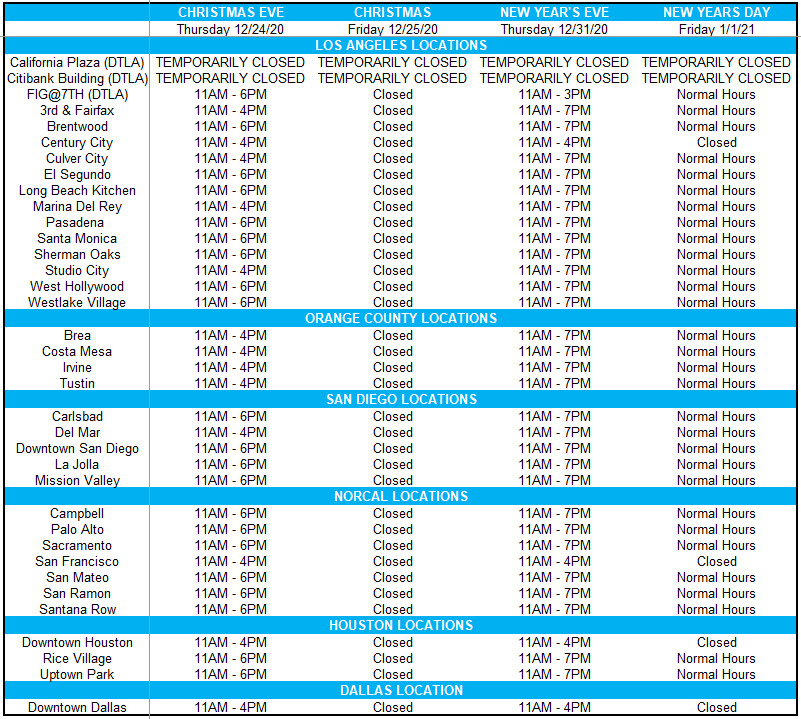 May your holidays be filled with all your favorite things! Here at Mendocino Farms, happiness and community are at the top of our list, which is why we are adjusting our hours to give our team the chance to enjoy this special time with those they love. Please note your neighborhood Mendocino Farms location’s holiday hours below, and please click here to reference our regular location hours.